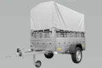 Grande remorque à benne basculante avec bâche haute grise, rehausses de ridelles grillagées et roue jockey du modèle Garden Trailer 230 KIPP. C’est le dernier modèle dans notre offre. Grâce à la grande surface de transport de 230×125 cm, la remorque vous permettra de transporter de lourdes charges ou d’objets de grandes dimensions qui ne seraient normalement pas transportables dans votre voiture. En outre, le PTAC maximal de 750 kg permet à chaque conducteur de fixer la remorque au crochet. La bâche haute avec arceau et rehausses de ridelles grillagées offrent une protection supplémentaire pour les marchandises transportées. En utilisant l’essieu directeur moderne de la marque AL-KO ou KNOTT, nous garantissons qu’aucun trou sur la route ne va poser de problèmes, même lorsque vous voyagez avec une surface de transport déchargée. Avec notre grande remorque à benne basculante du modèle Garden Trailer 230 KIPP, le transport de vos biens sera toujours confortable et sécuritaire.