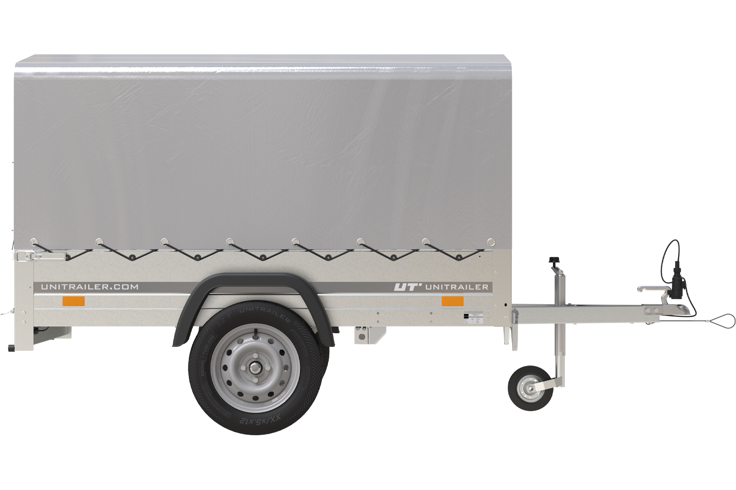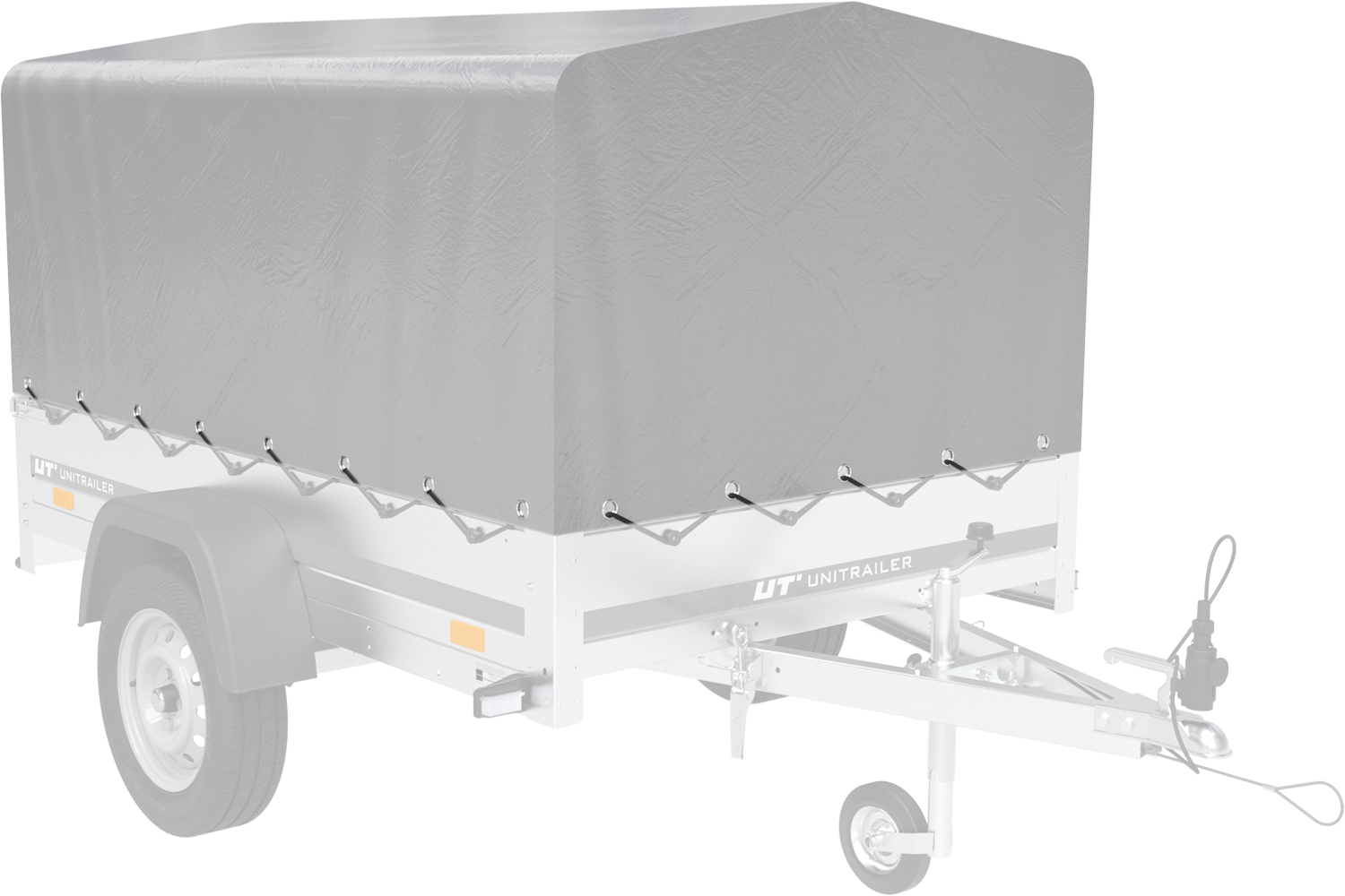 Remorque 750 kg de la marque UNITRAILER, modèle Garden Trailer 201 KIPP avec bâche dôme et arceau. Remorque universelle basculante. PTAC par défaut 500 kg en France et 750 kg en Belgique.